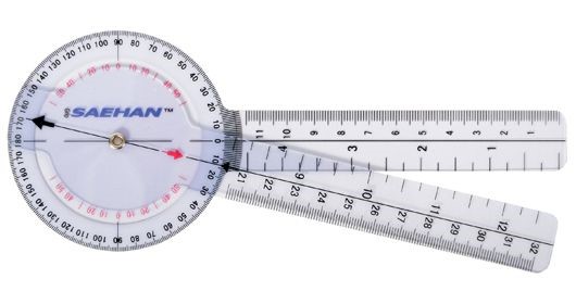- Goniómetro em plástico transparente que permite a observação do eixo da articulação do movimento e a sua amplitude de movimento.